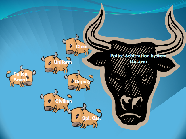 A huge bull is prominently displayed in slide 21, with no title, but one can speculate its meaning with the bull’s label: Police Arbitration System Ontario.